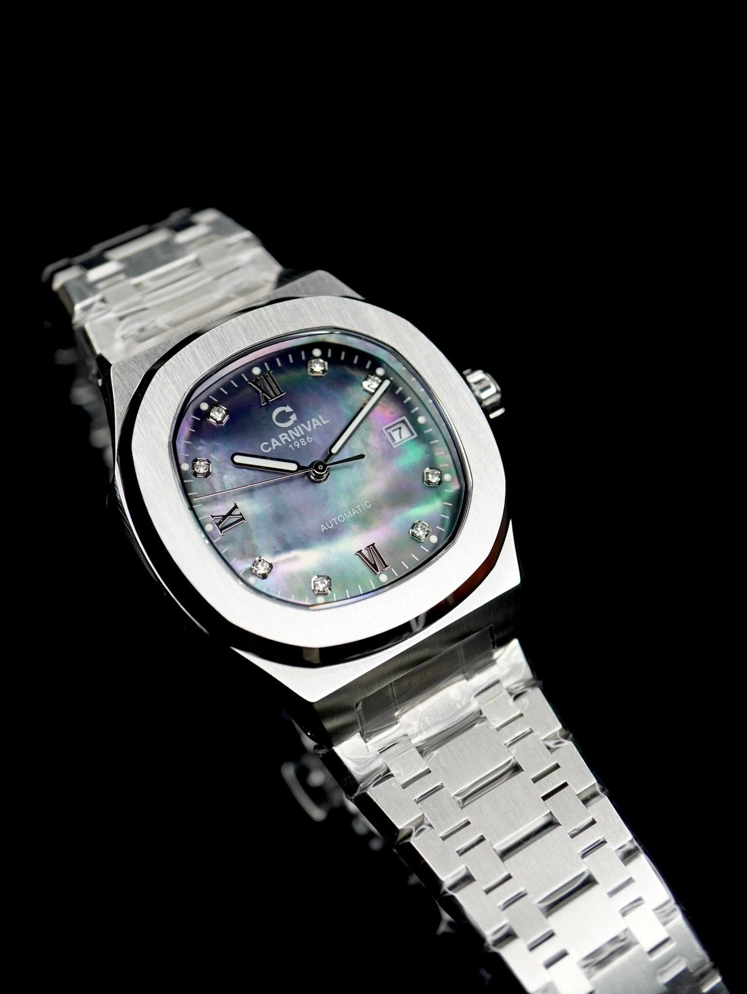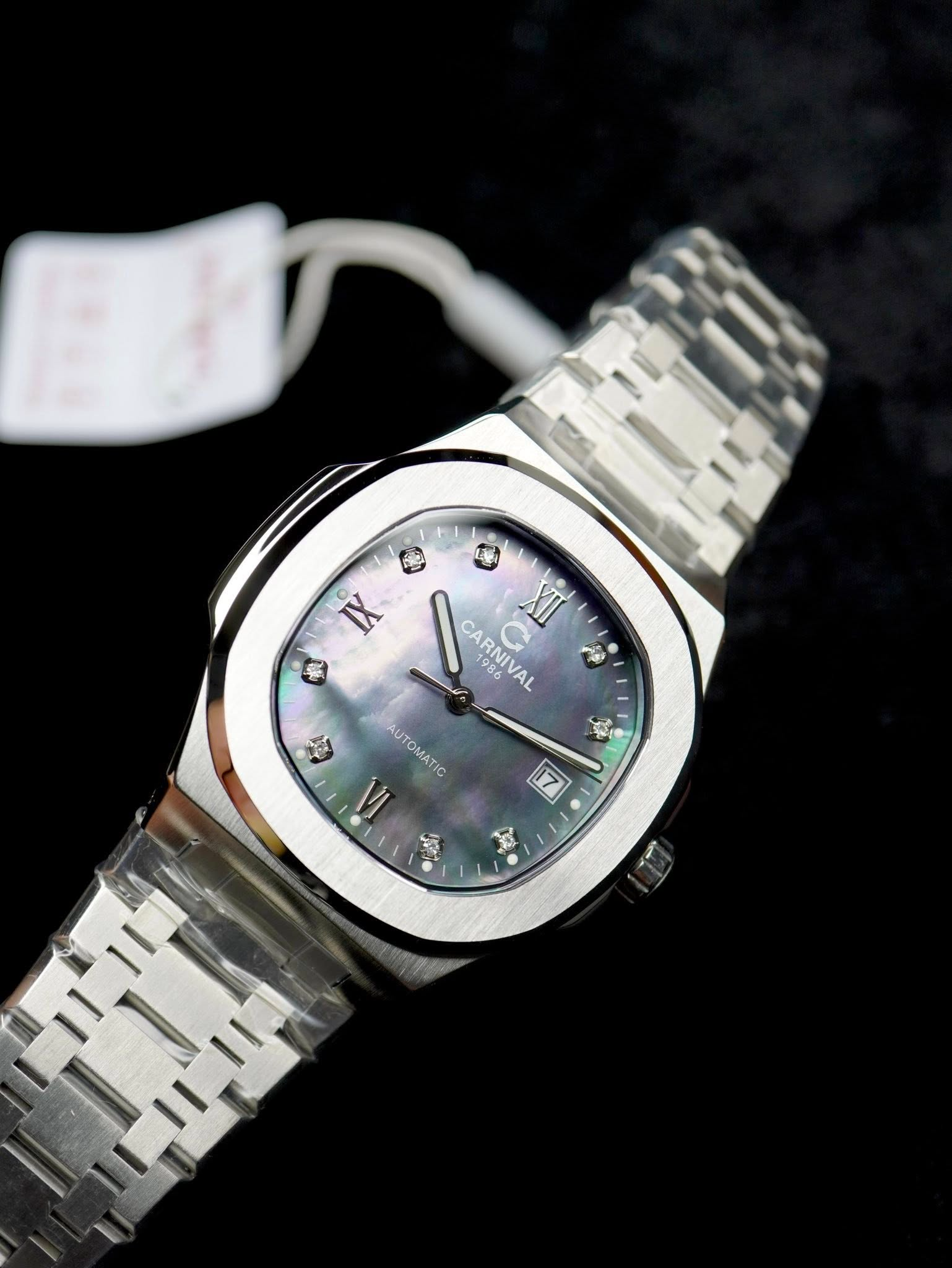 - Thiết kế sang trọng, hiện đại với mặt số xà cừ và chi tiết đính đá hút mắt