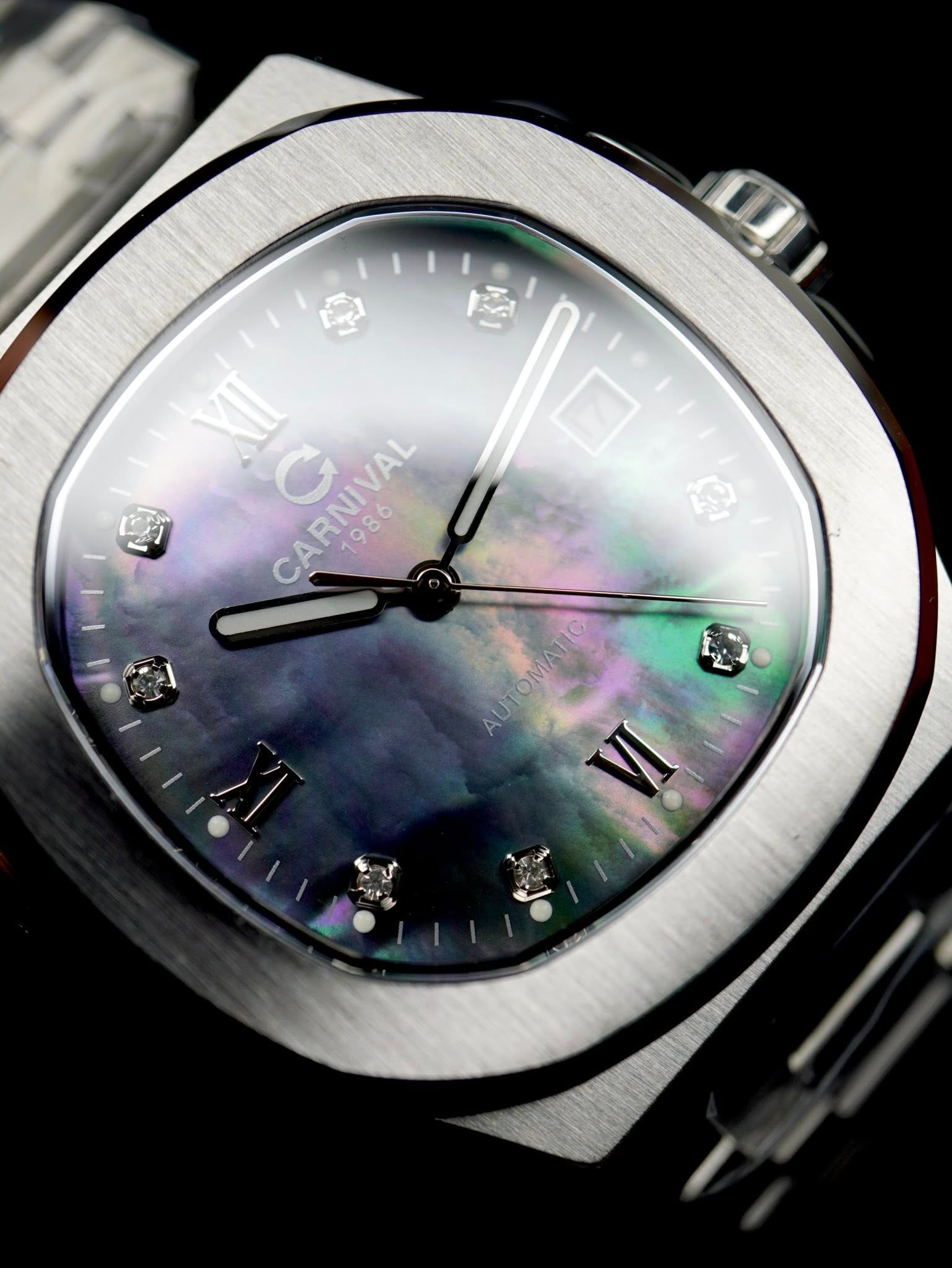 Mặt đồng hồ mang phong cách tròn cổ điển với đường kính 41mm – một kích thước cân đối, lý tưởng cho cổ tay nam giới châu Á. Nổi bật trên nền mặt là chất liệu xà cừ đen tự nhiên, tạo hiệu ứng ánh sáng chuyển sắc đầy cuốn hút và độc đáo mỗi khi nghiêng cổ tay. Các cọc số được đính đá tinh xảo, bắt sáng tốt để tăng thêm phần sang trọng, đẳng cấp. Kim đồng hồ và phần cọc số được đánh bóng tỉ mỉ, có phủ dạ quang nhẹ hỗ trợ xem giờ ban đêm – một điểm cộng cho sự tiện dụng.
