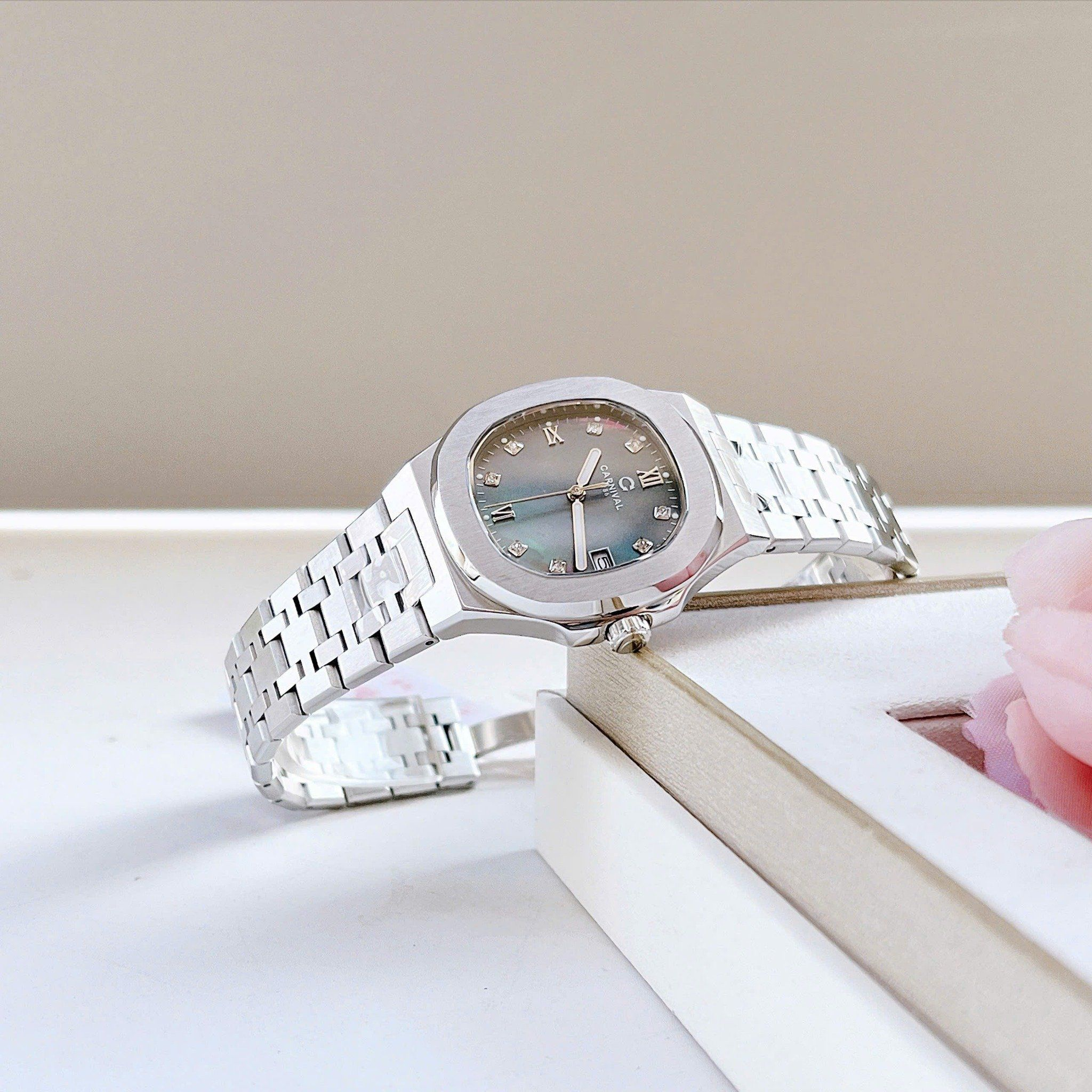 Mặt số là điểm nhấn đặc biệt: lớp nền xà cừ đen óng ánh tạo hiệu ứng thay đổi màu tùy theo ánh sáng và góc nhìn. Viền mặt chỉ dày 7.8mm, kết hợp kính sapphire nguyên khối trong suốt, cứng cáp, chống trầy xước gần như tuyệt đối – một lựa chọn đắt giá trong tầm giá đồng hồ nữ trung cấp.