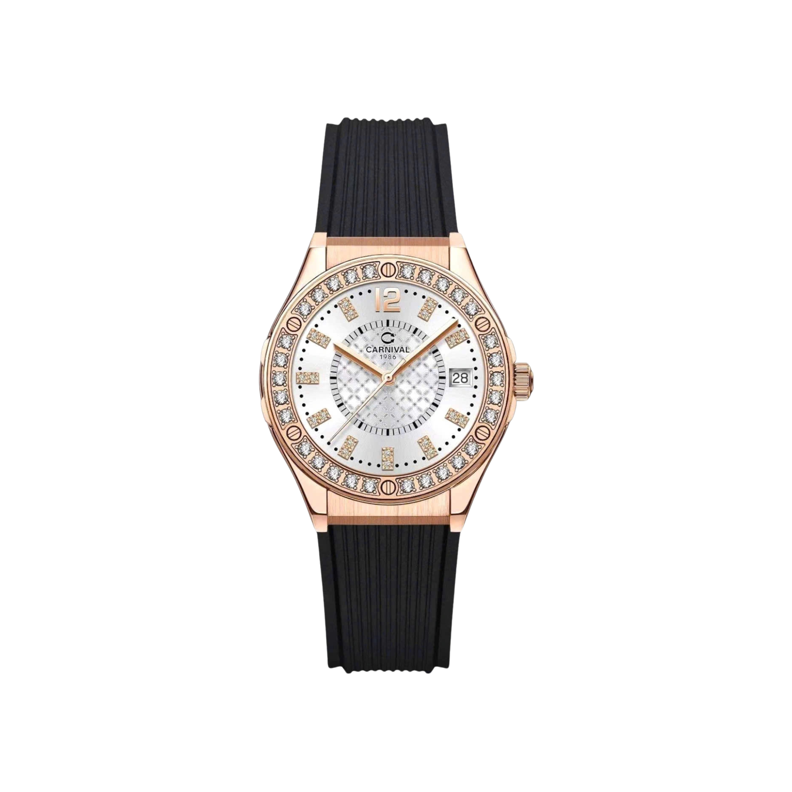 Điểm cộng đáng chú ý là thiết kế gợi nhớ đến các dòng đồng hồ cao cấp như Hublot hay Ferragamo F80 – bởi vậy mẫu mã này còn được gọi là “tiểu Hublot Carnival”. Tổng thể toát lên vẻ đẹp hiện đại pha chút cá tính nhưng vẫn giữ sự mềm mại nữ tính.